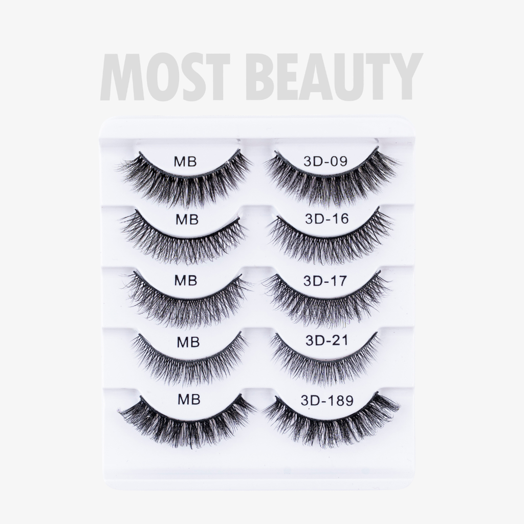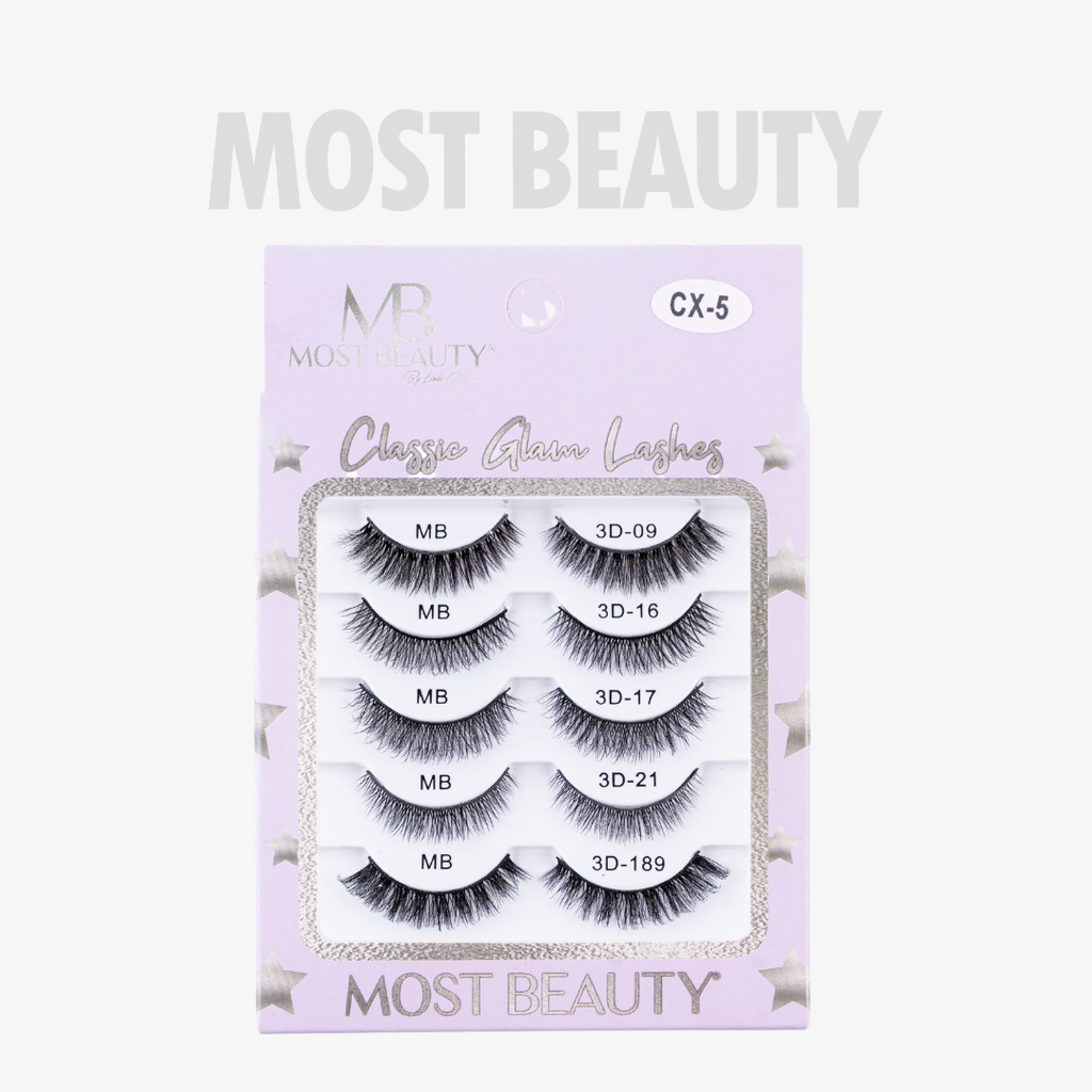 Este kit x 5 reúne nuestras referencias de pestañas más vendidas:  09, 16, 17, 21 y 189, todas con una terminación natural. Es ideal para usar en toda ocasión, para lucir cada día de la semana elegante, auténtica y casual, todo en uno.
